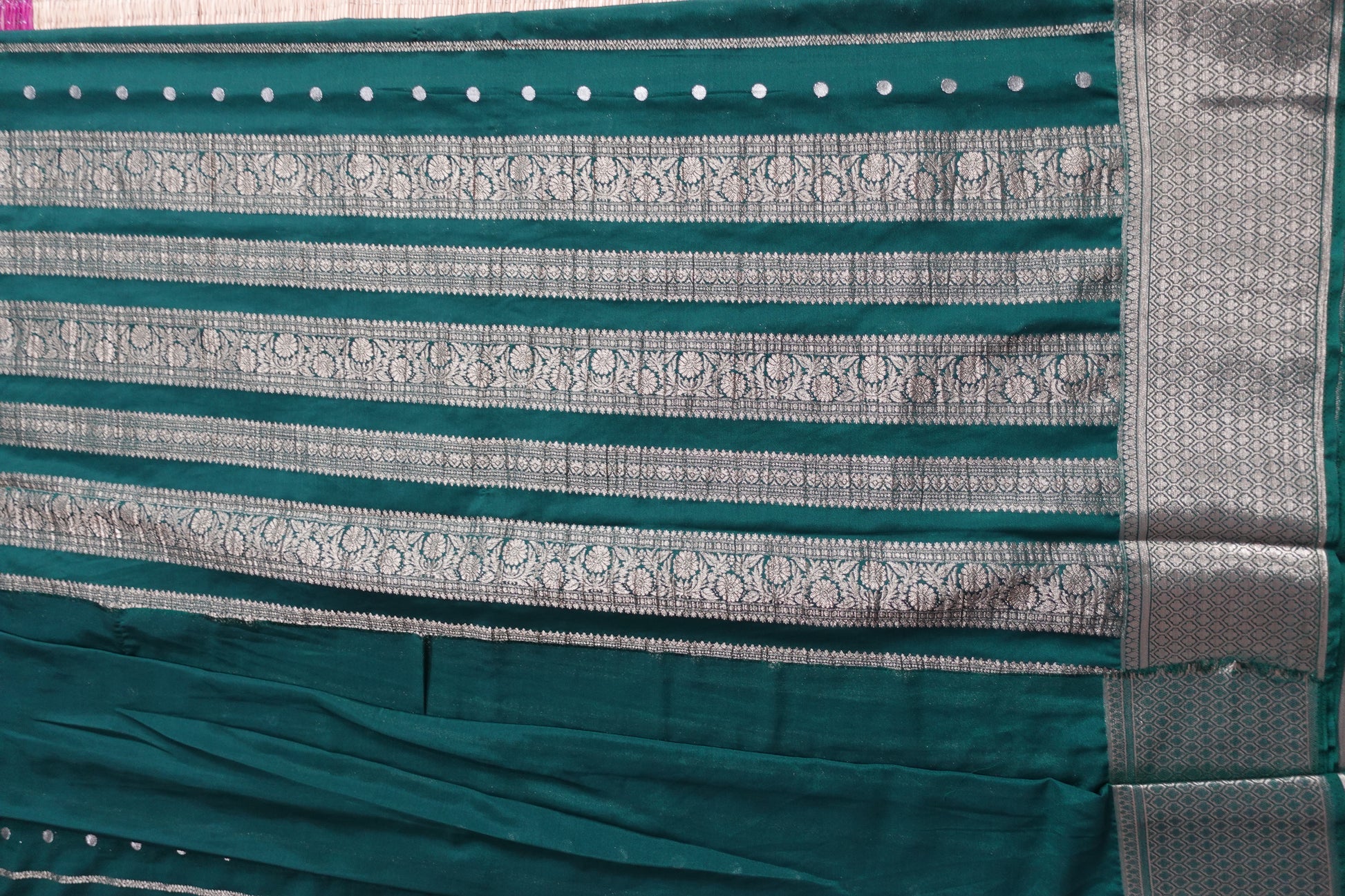A bottle green colored crepe saree with 4-inch golden zari weaving (MCAUG131)