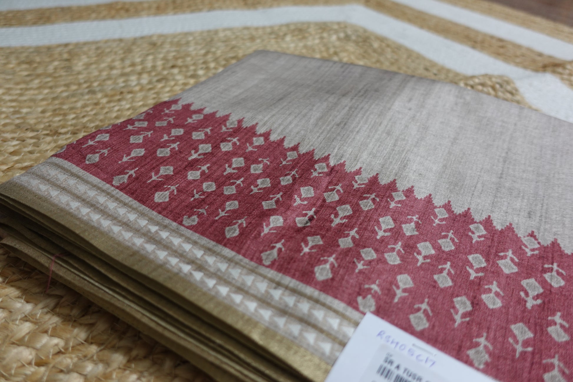 Exude subtle sophistication with this beige-colored semi-Tussar saree, elegantly framed by rich maroon borders that add depth and contrast to its soft, neutral base. The semi-Tussar fabric offers a textured finish with a breathable, lightweight drape—perfect for festive gatherings, cultural events, or graceful everyday wear. This saree blends minimalism with tradition, making it a versatile and timeless addition to your ethnic wardrobe.