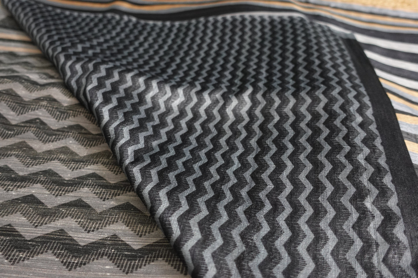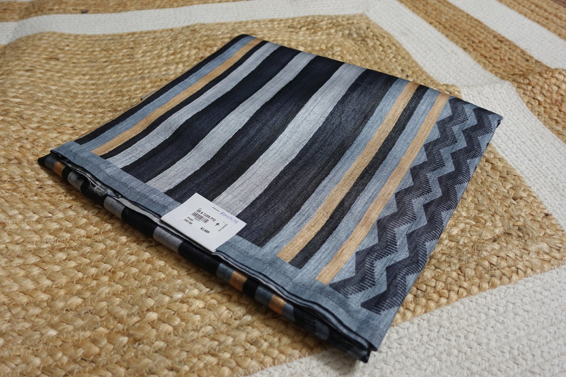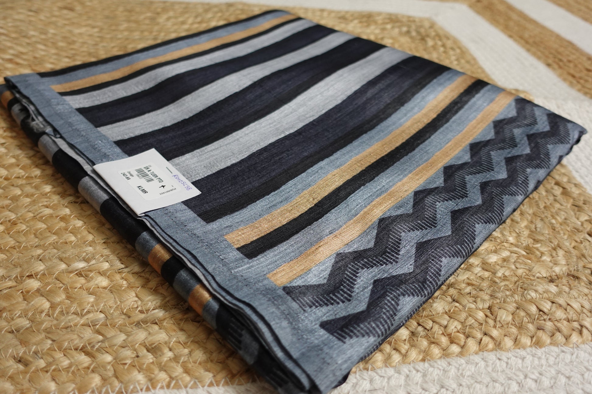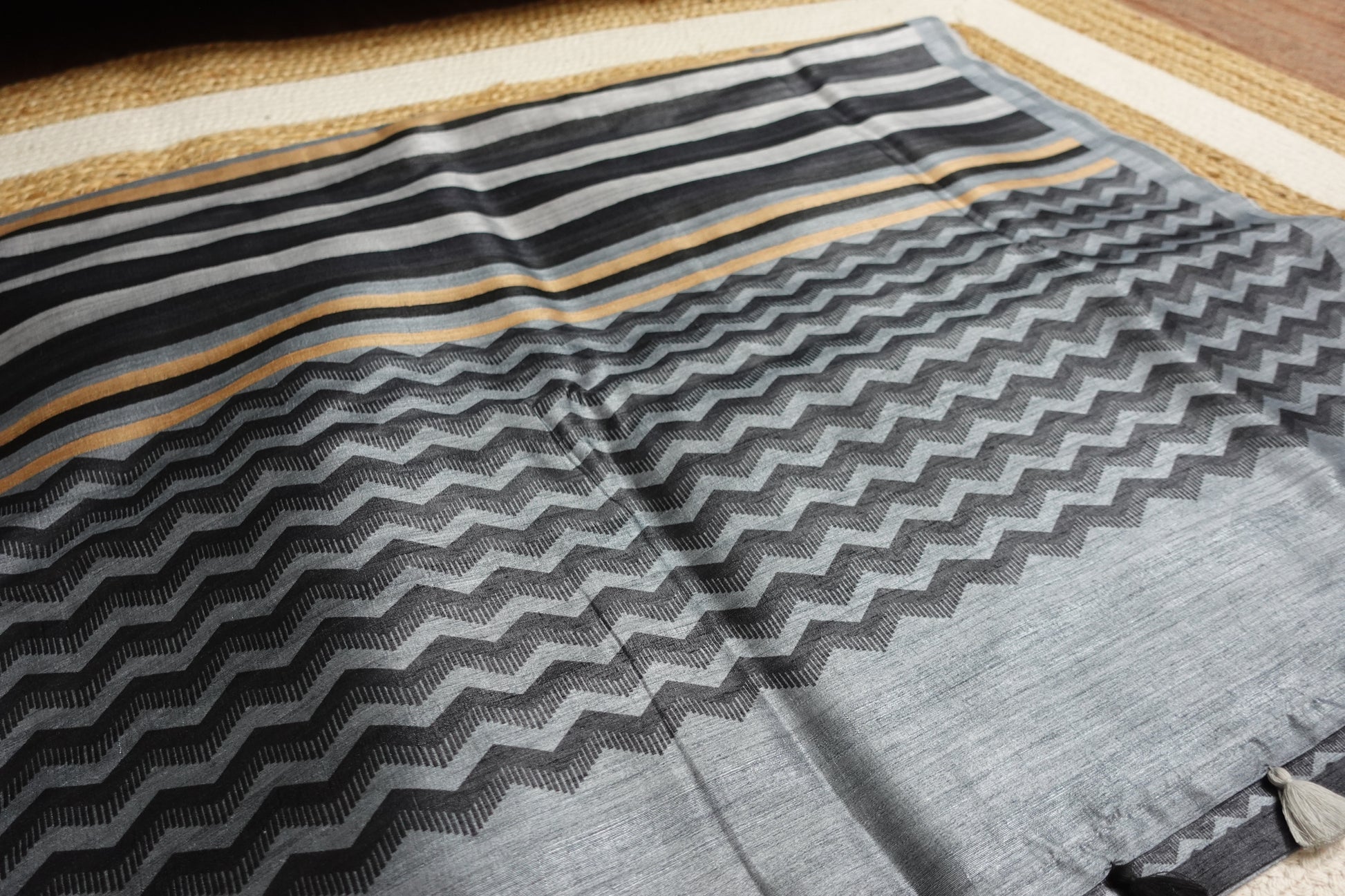 Make a bold and contemporary statement with this black, cement, and gold-colored semi-Tussar saree, featuring elegant vertical line patterns that add a sleek, structured appeal. The harmonious blend of deep black, muted cement grey, and shimmering gold creates a sophisticated palette that’s perfect for both festive occasions and formal gatherings. Crafted from semi-Tussar fabric, the saree offers a rich texture with a breathable, lightweight drape—combining comfort with timeless style. This saree is ideal for those who appreciate modern design rooted in traditional elegance.