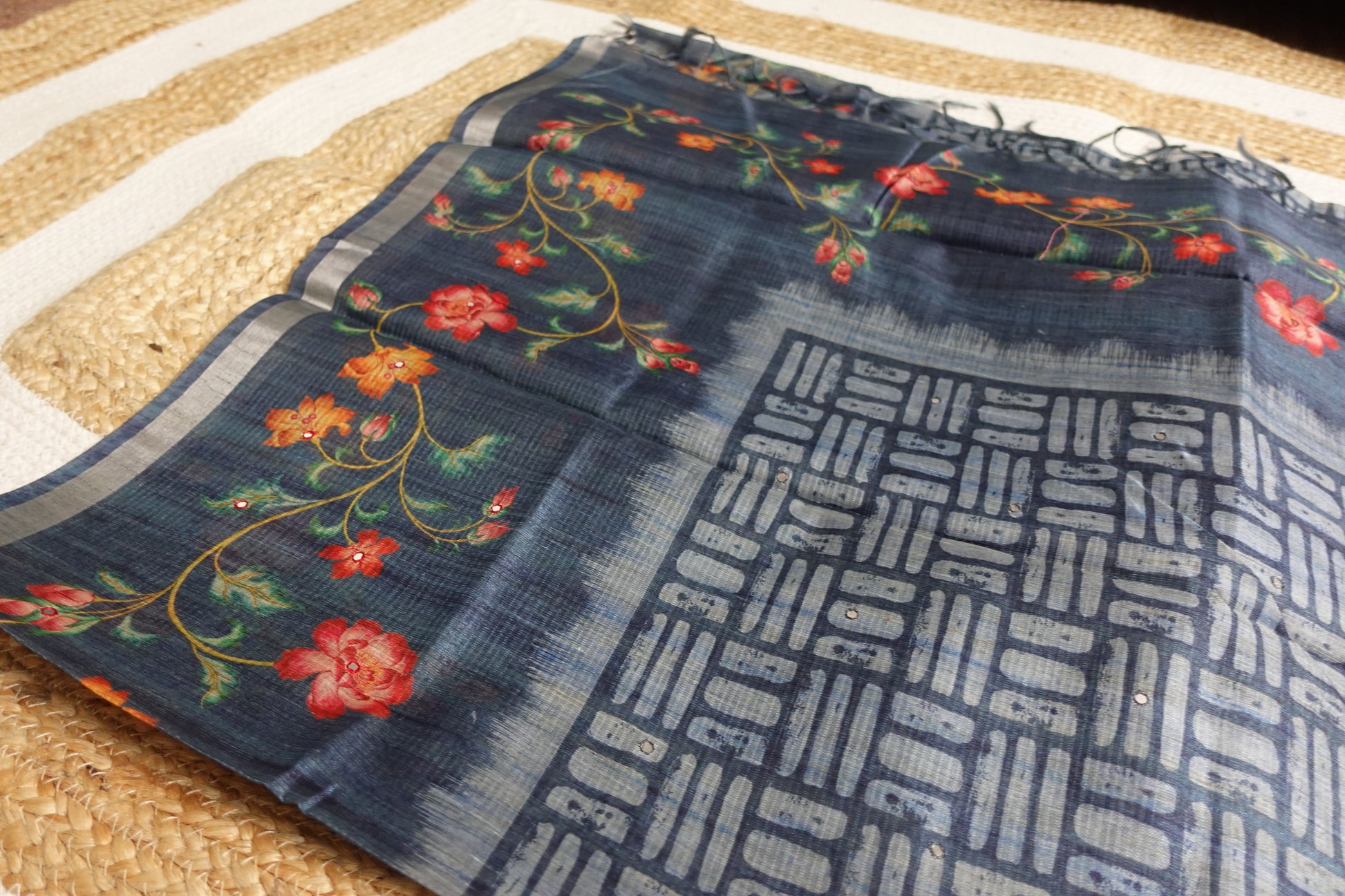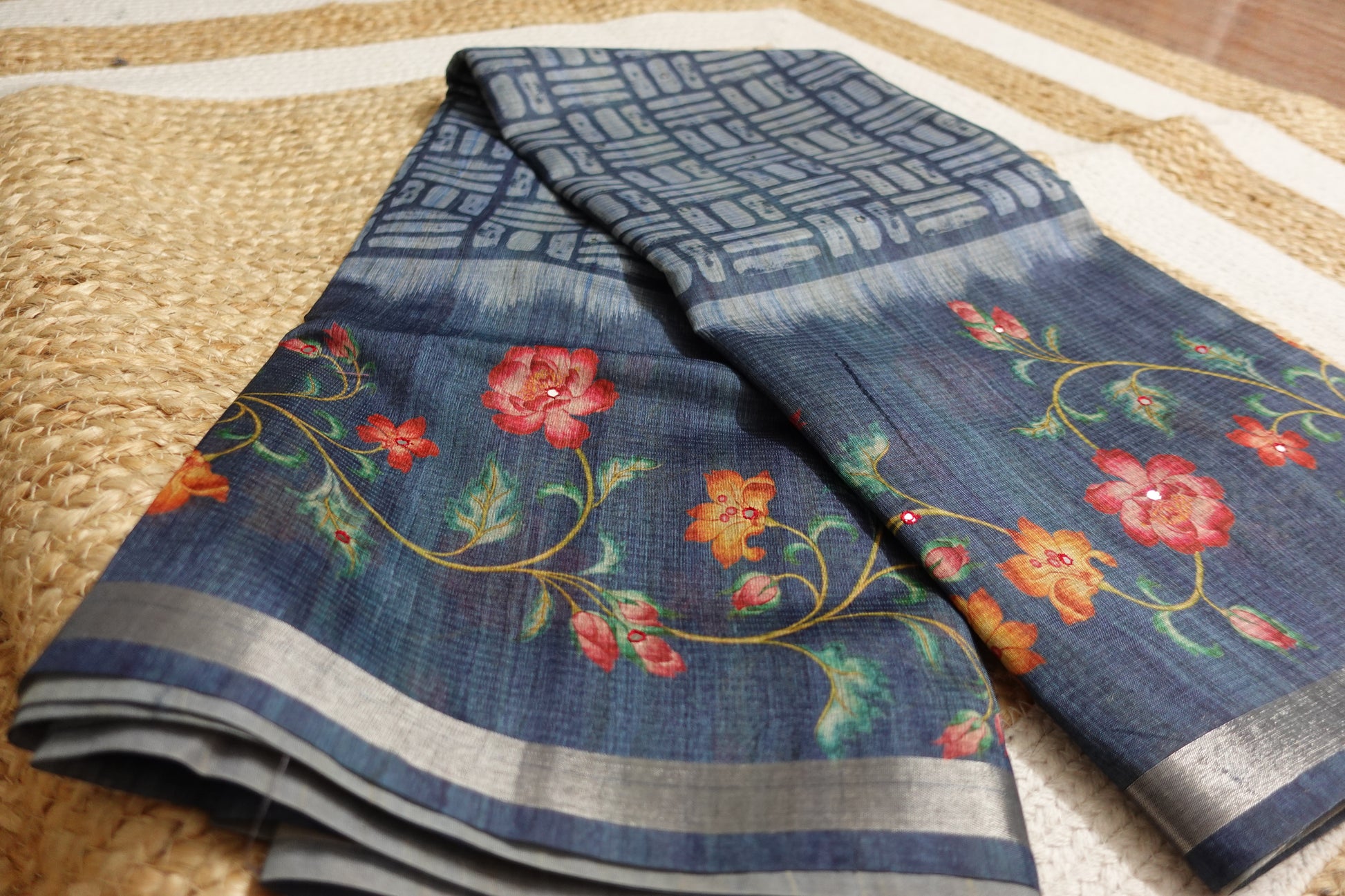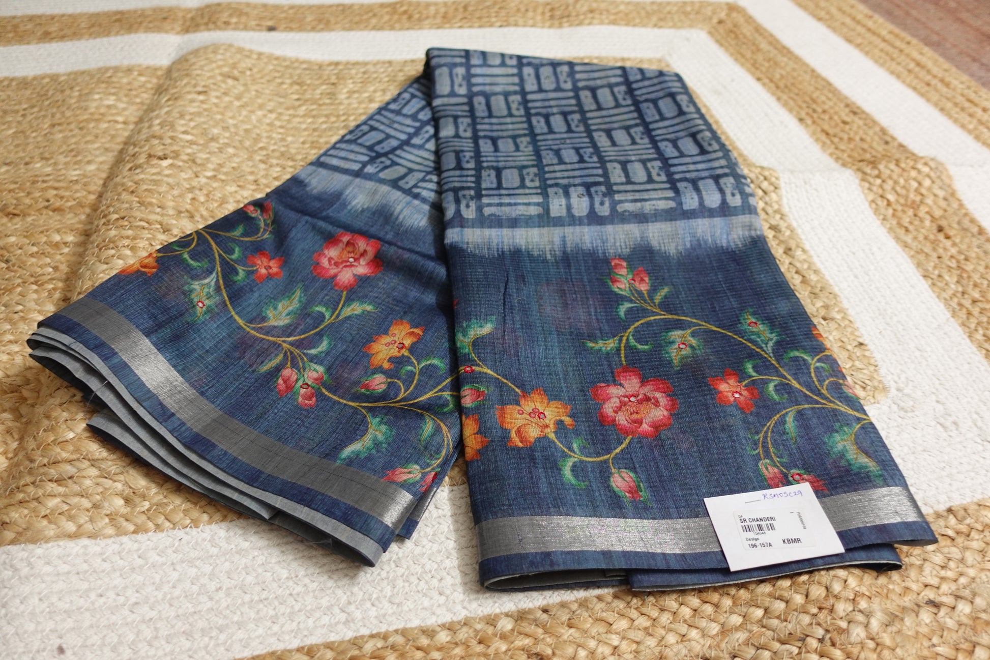 A denim colored semi-Chanderi Saree with Floral Borders and Brick Pattern