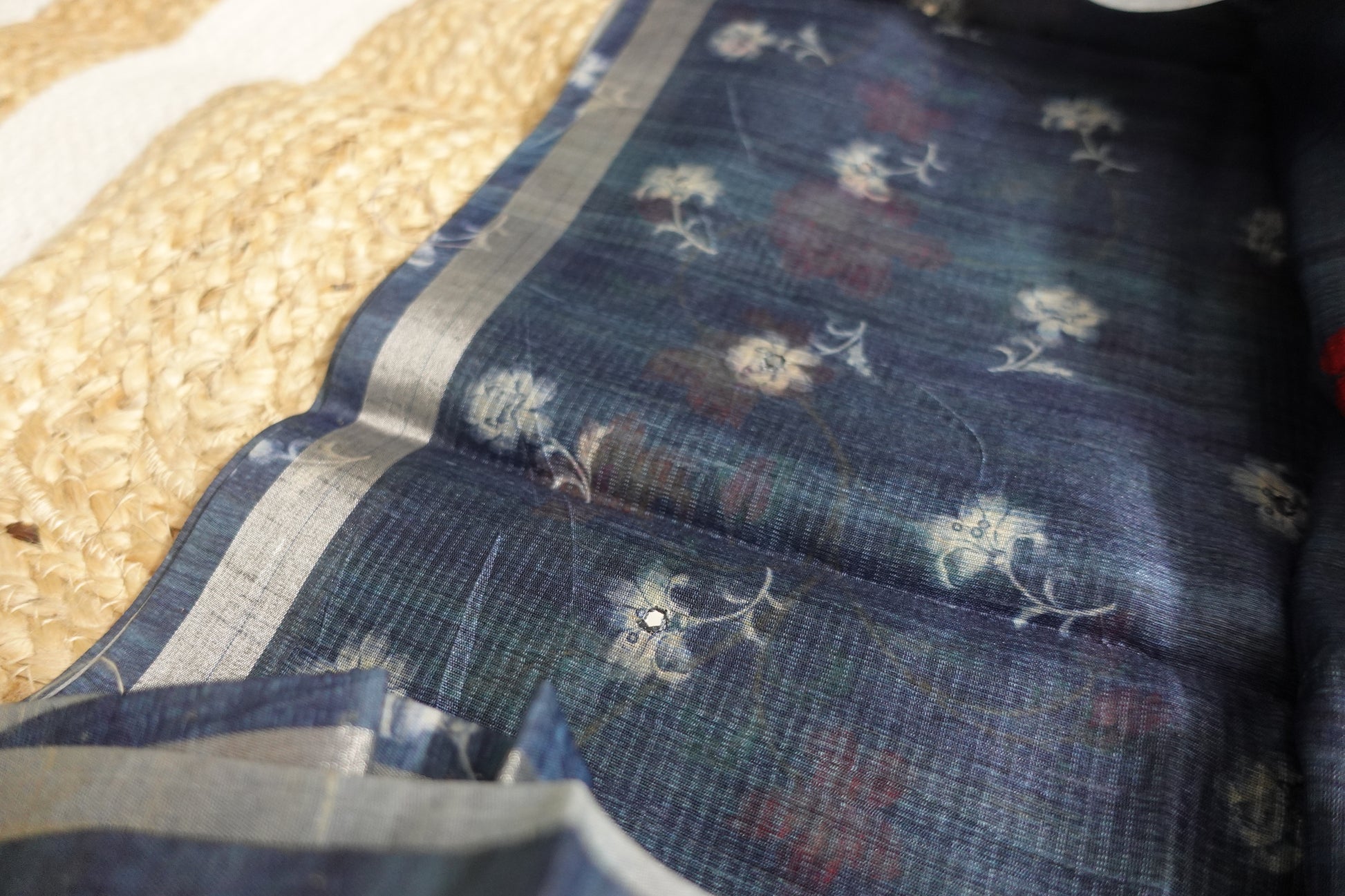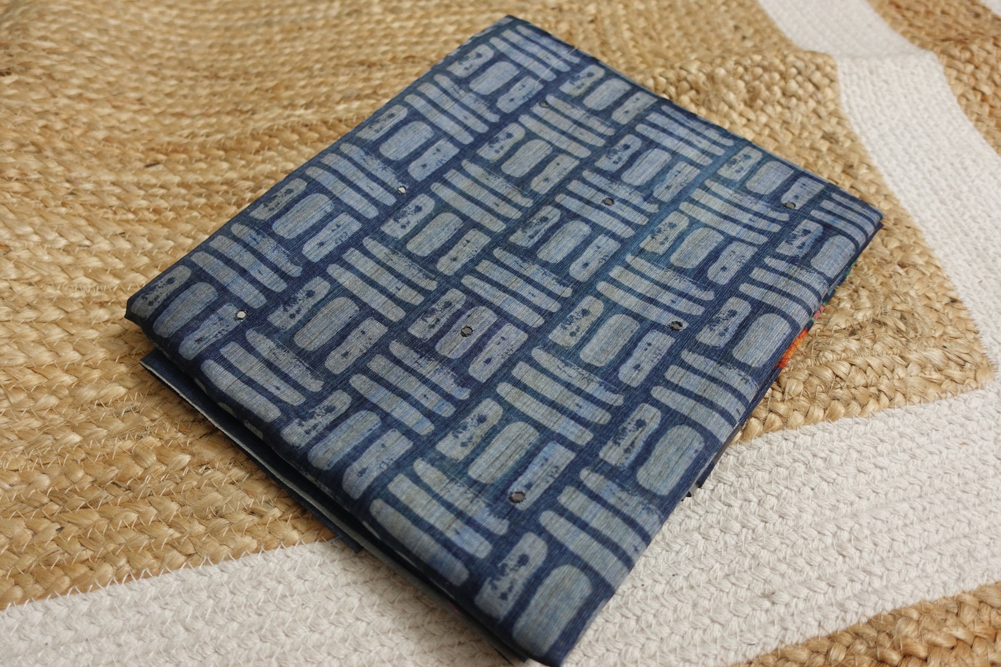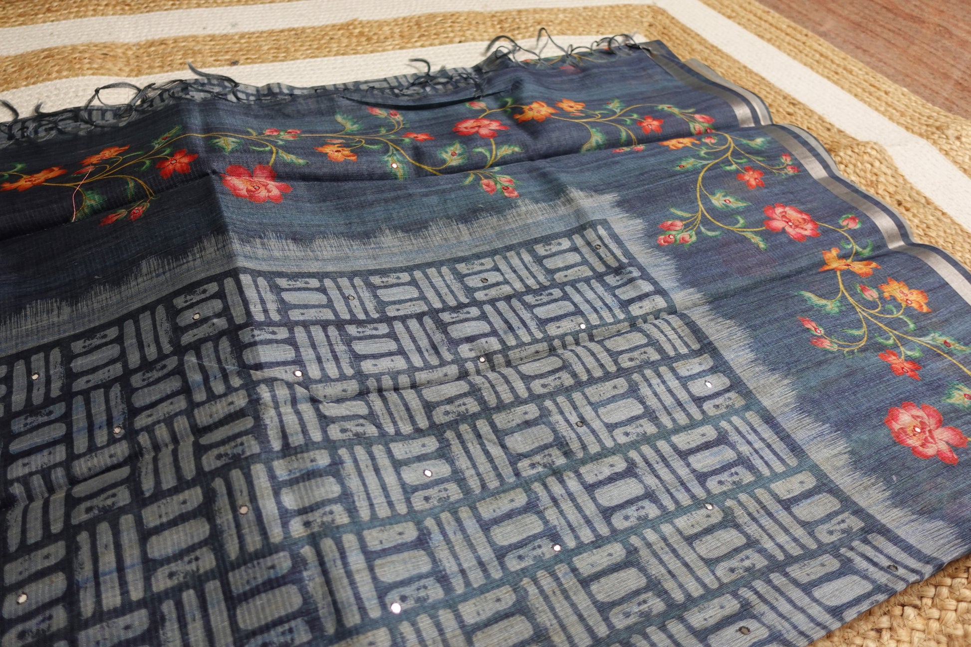 A denim colored semi-Chanderi Saree with Floral Borders and Brick Pattern