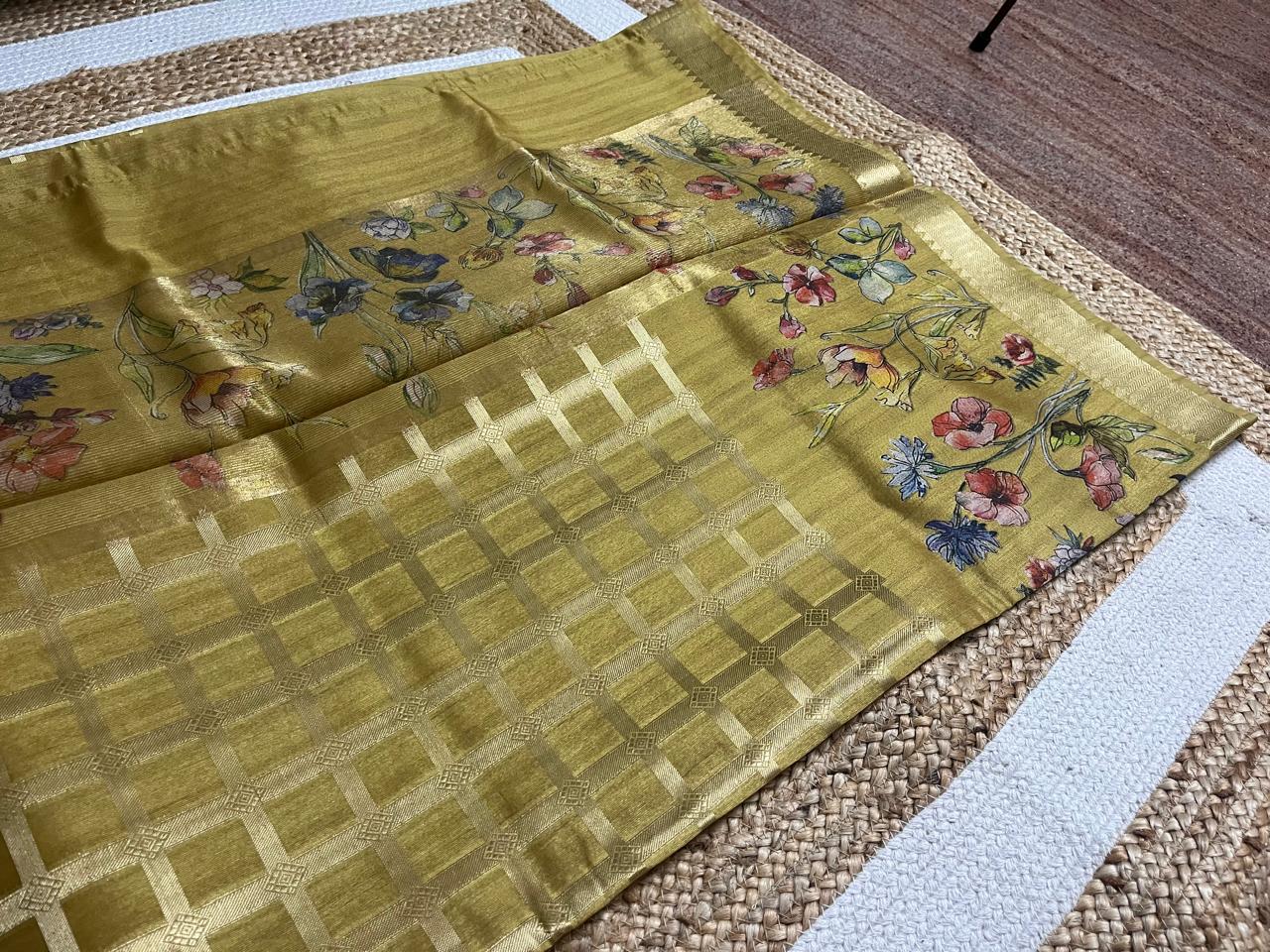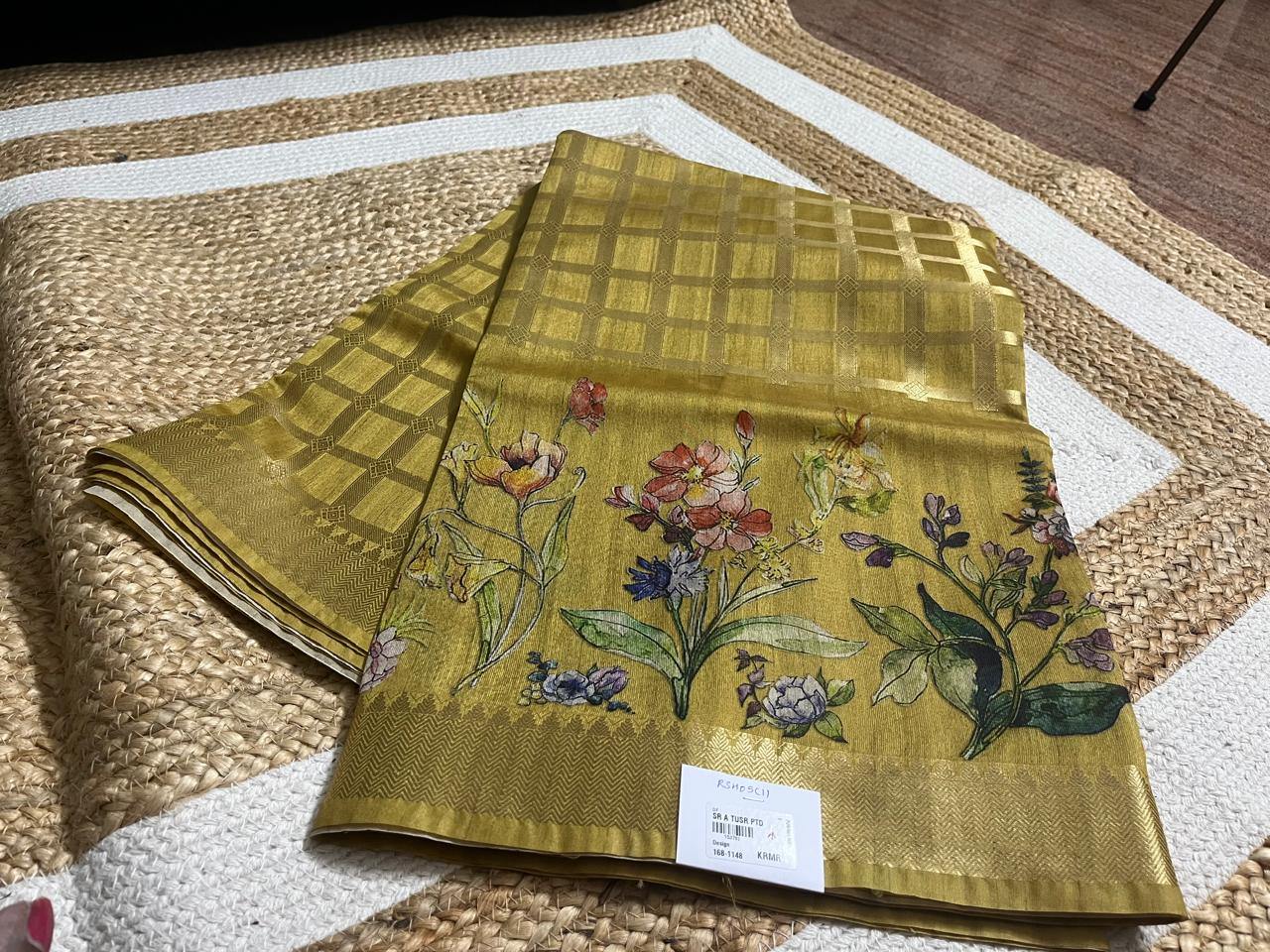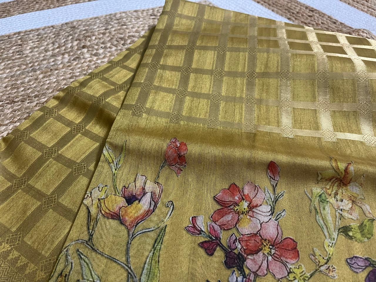 Add a touch of warmth and elegance to your ethnic wardrobe with this mustard yellow semi-Tussar saree, featuring delicate floral prints along the borders that bring a soft, feminine charm. The body of the saree is adorned with golden checks, lending a subtle shimmer and structured appeal to the overall look. Crafted from semi-Tussar fabric, it offers a rich texture with a breathable, lightweight feel—perfect for festive occasions, cultural events, or graceful daywear. This saree beautifully blends tradition with contemporary design, making it a versatile and eye-catching choice.