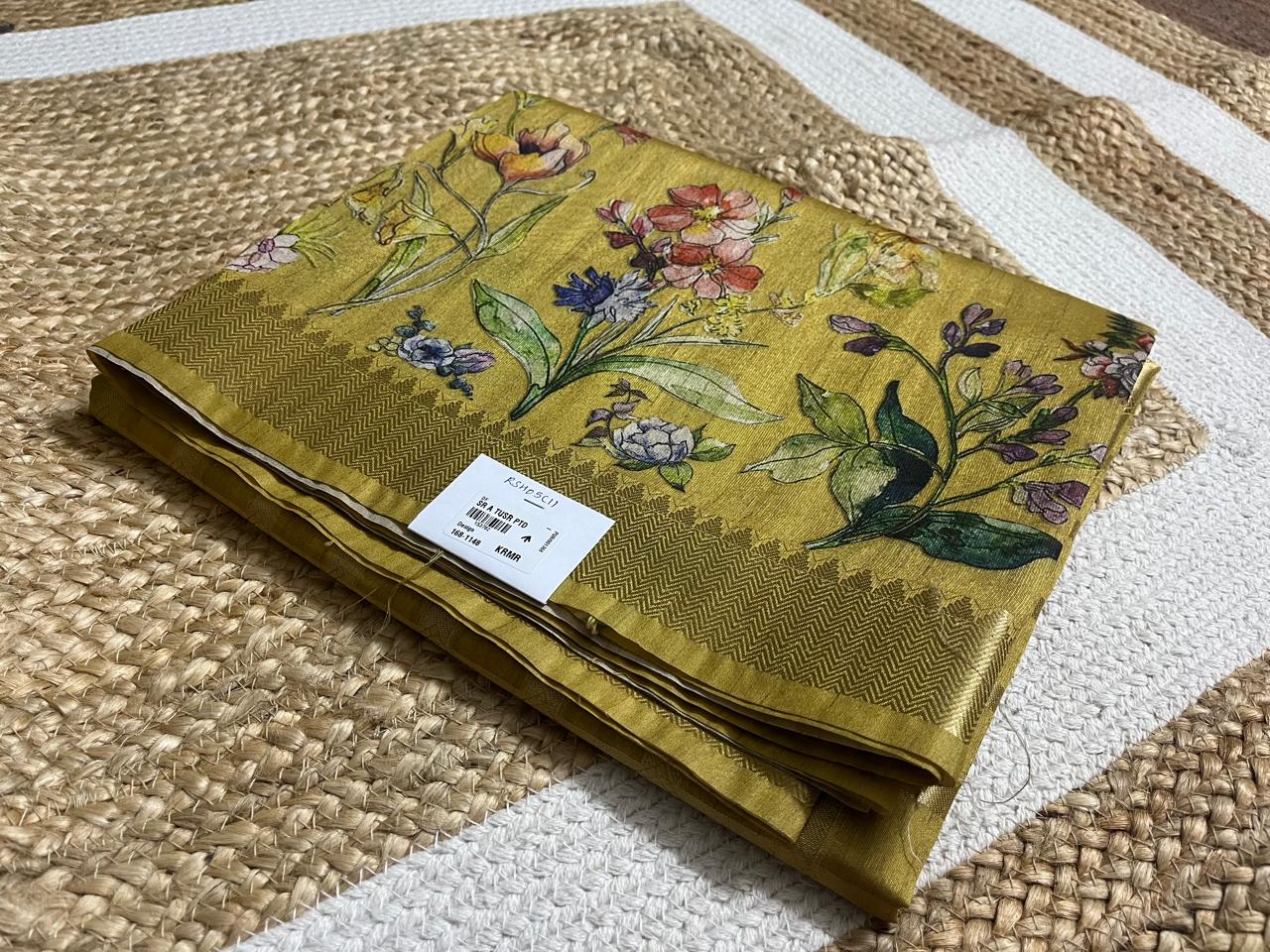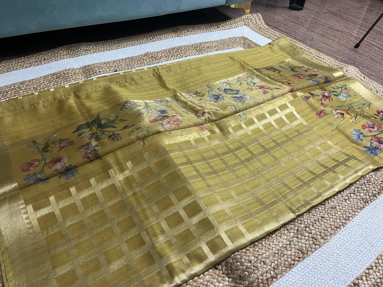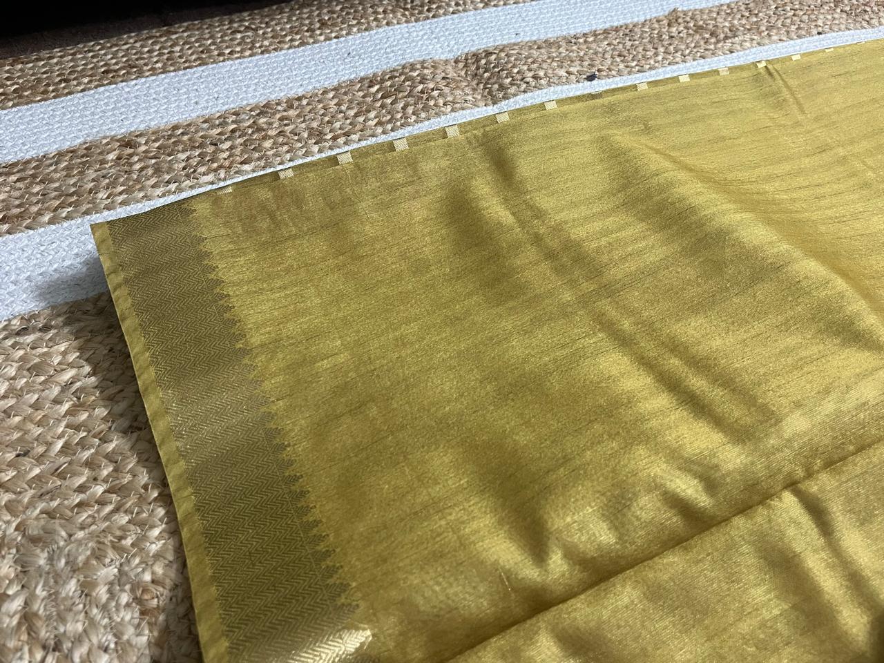 Add a touch of warmth and elegance to your ethnic wardrobe with this mustard yellow semi-Tussar saree, featuring delicate floral prints along the borders that bring a soft, feminine charm. The body of the saree is adorned with golden checks, lending a subtle shimmer and structured appeal to the overall look. Crafted from semi-Tussar fabric, it offers a rich texture with a breathable, lightweight feel—perfect for festive occasions, cultural events, or graceful daywear. This saree beautifully blends tradition with contemporary design, making it a versatile and eye-catching choice.