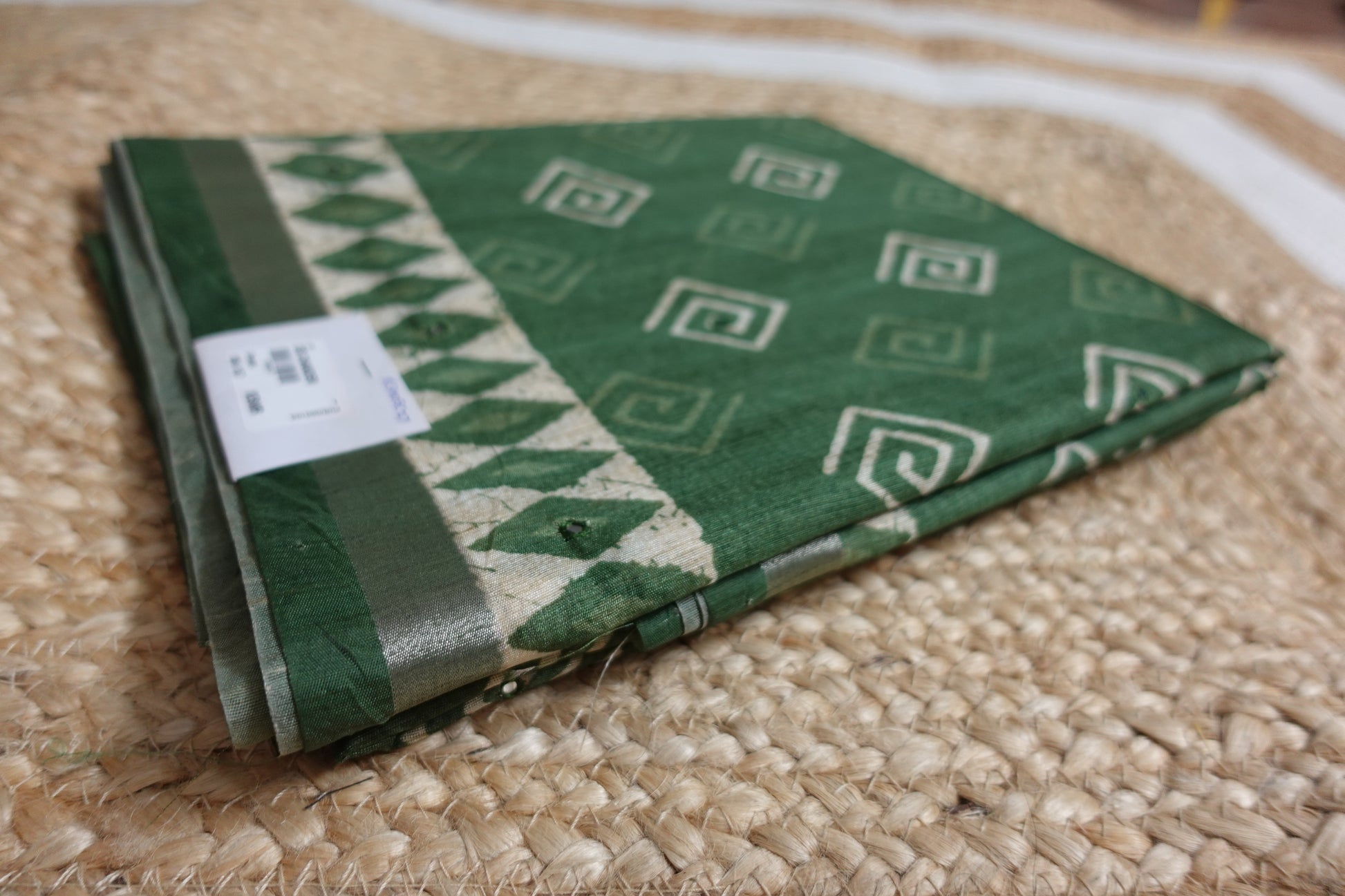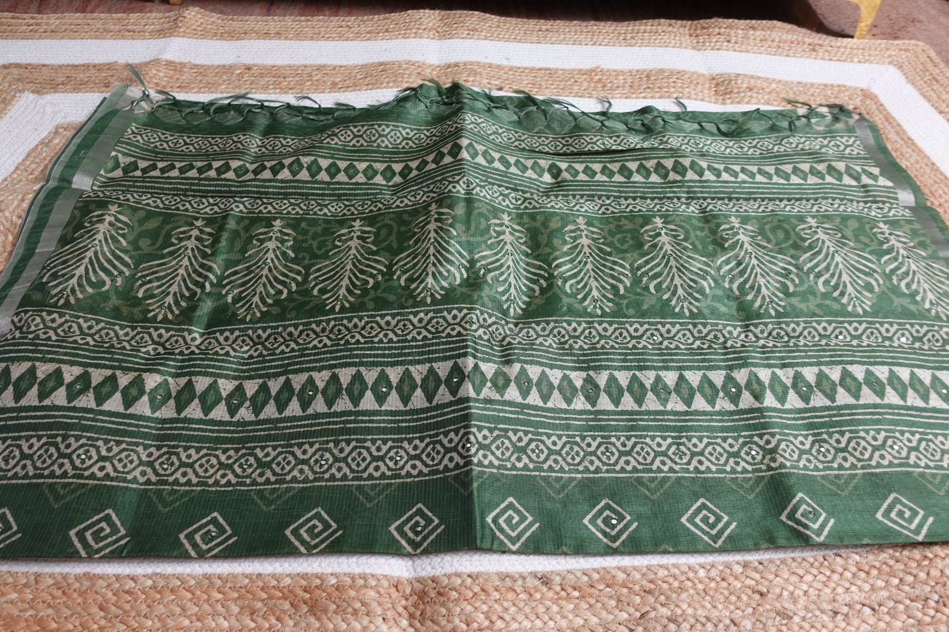 Step into timeless elegance with this bottle green semi-Chanderi saree, beautifully adorned with diamond pattern prints that lend a refined charm to its rich hue. The saree is framed with a sleek 1-inch silver border, adding a subtle shimmer that enhances its festive appeal. Crafted from semi-Chanderi fabric, it offers a soft, breathable texture and a graceful drape—perfect for both casual gatherings and celebratory occasions. This saree blends traditional motifs with a modern silhouette, making it a versatile addition to your ethnic collection.