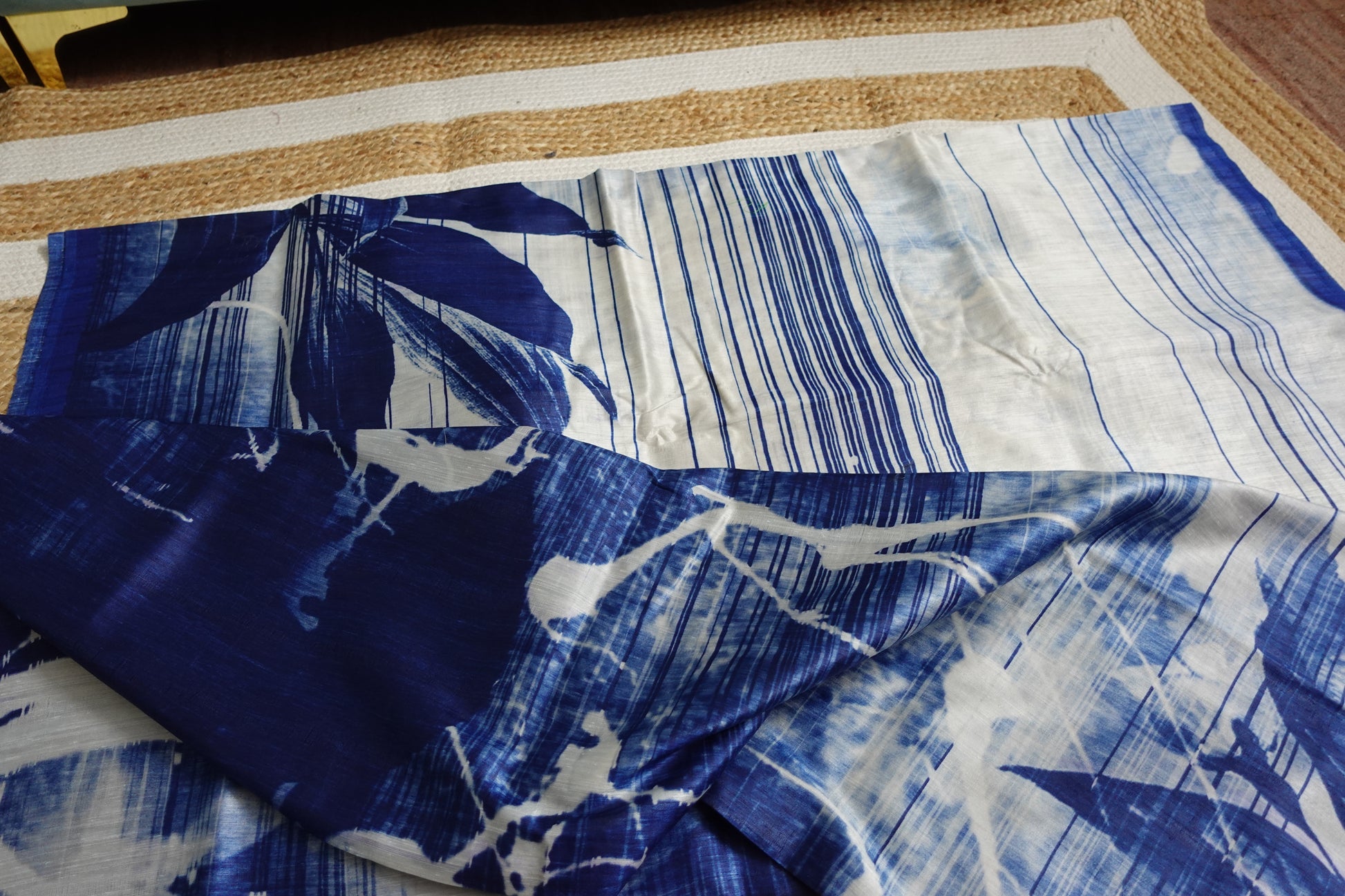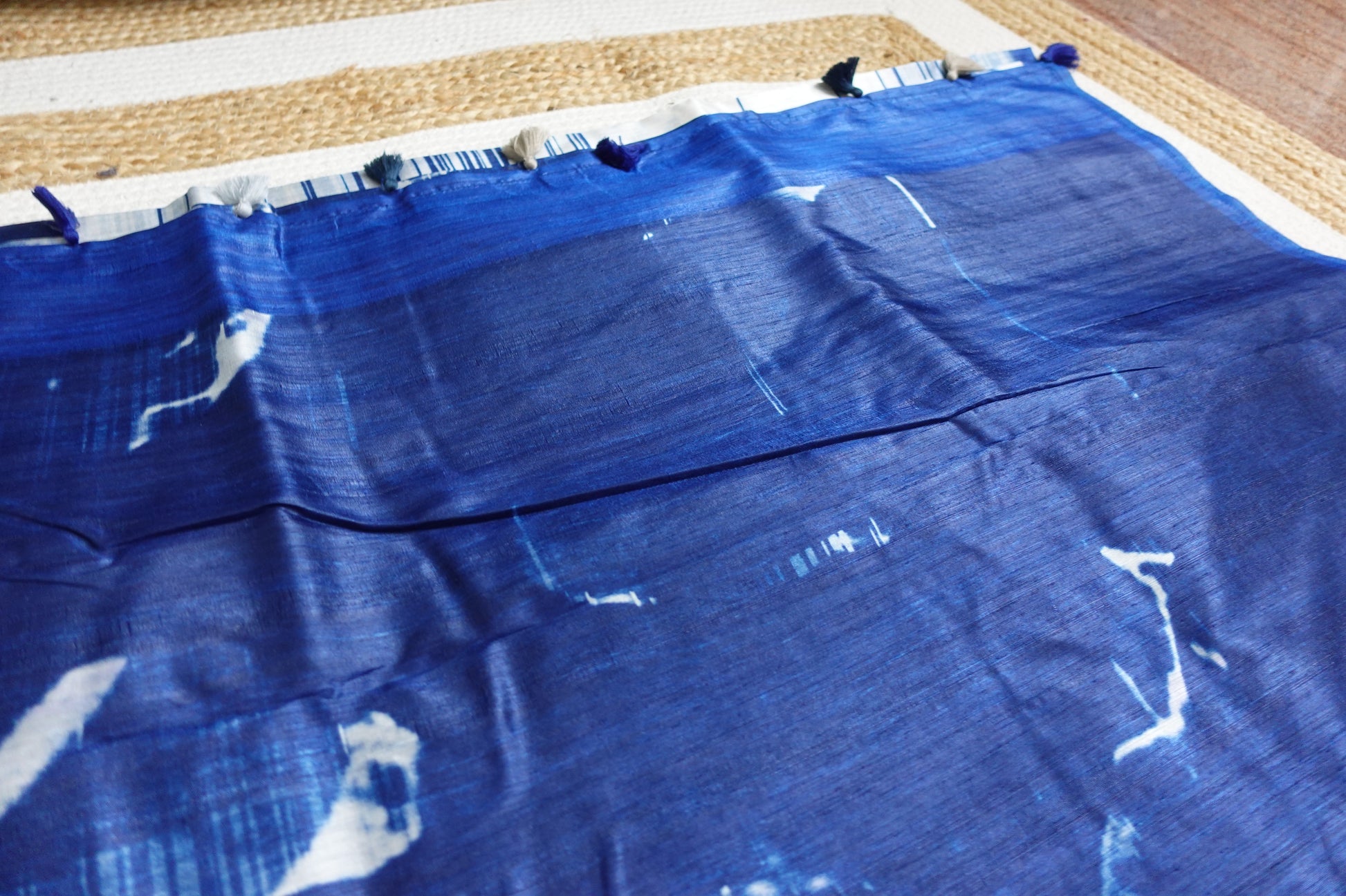 Embrace artistic elegance with this indigo-colored semi tussar saree, featuring abstract prints in varying shades of blue and white. The cool-toned palette evokes a sense of calm sophistication, while the abstract design adds a contemporary flair. Crafted from semi tussar fabric, it offers a soft texture and graceful drape, making it a versatile choice for both formal and casual occasions.