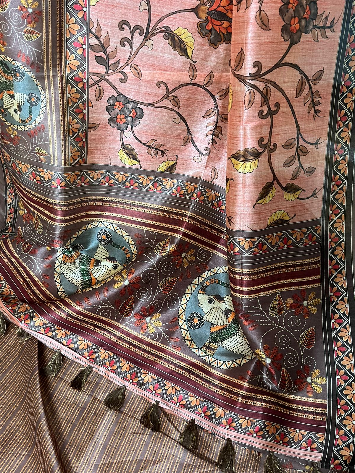 A peach colored Semi Tussar Kalamkari print saree with coffee colored border.