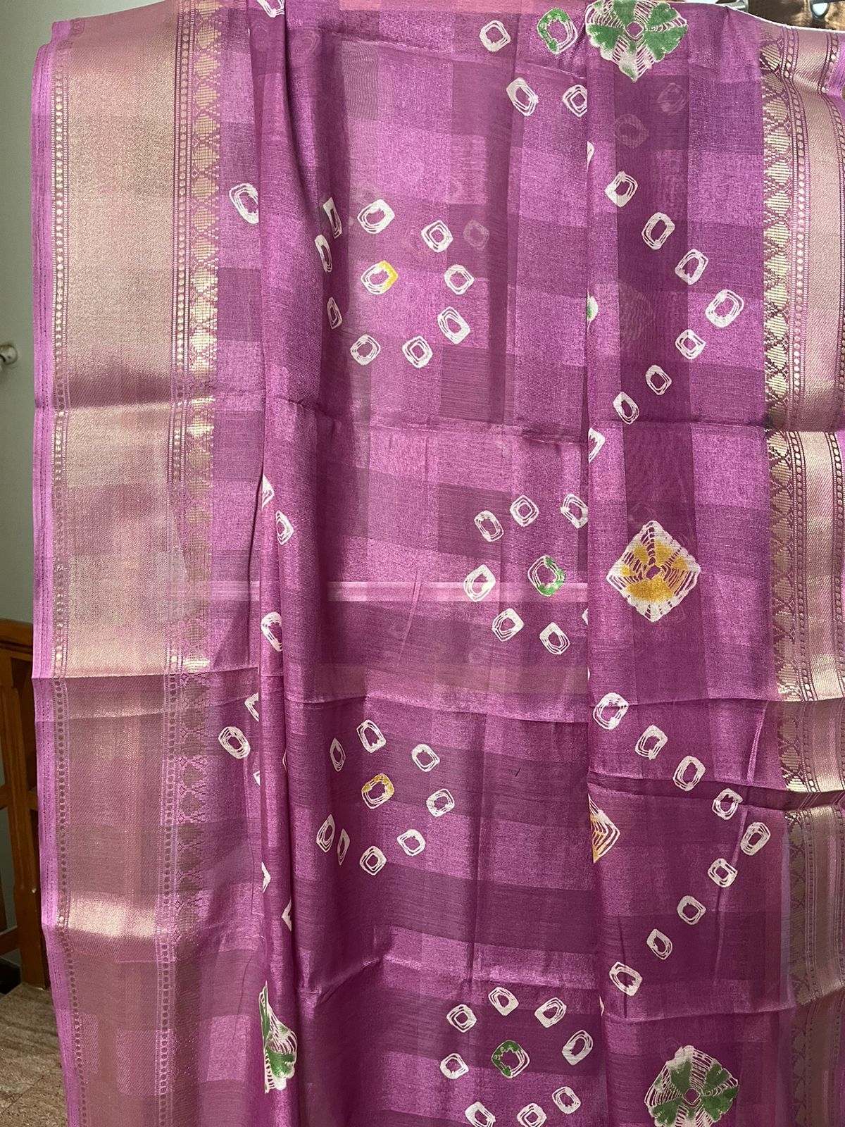 A pink colored assam silk saree with gold thread borders. The saree comes with bandhani prints allover the body. The blouse comes with vertical white lines.