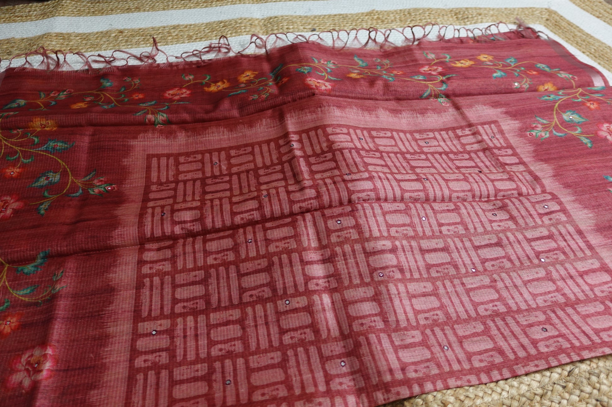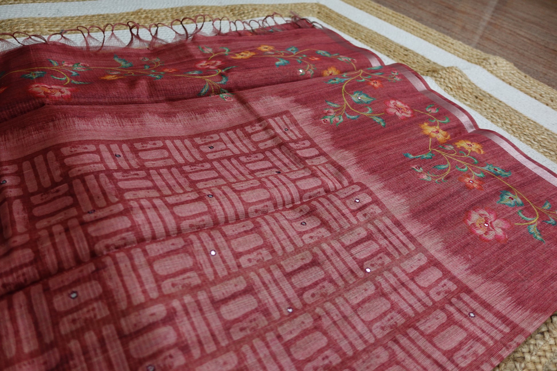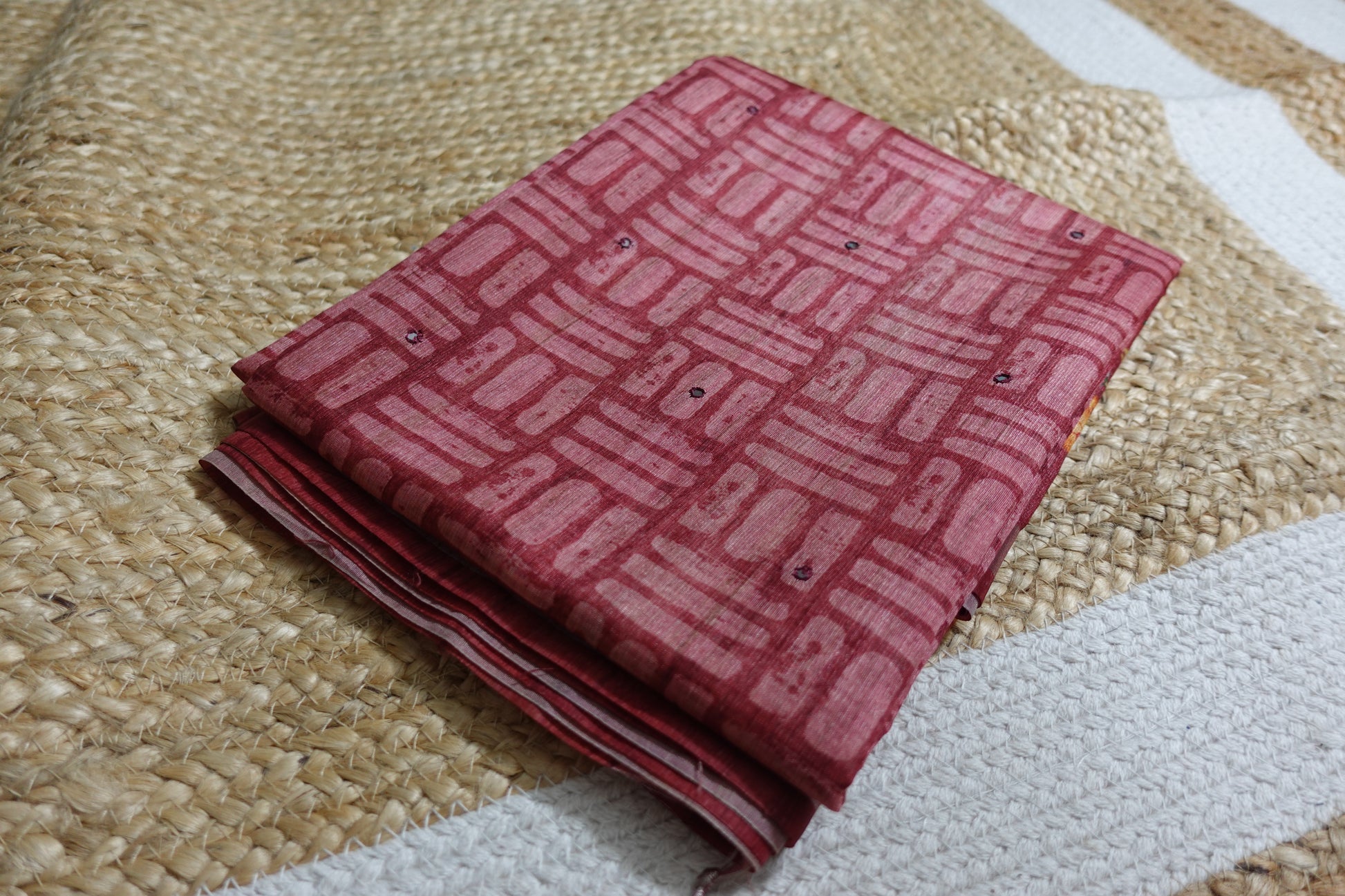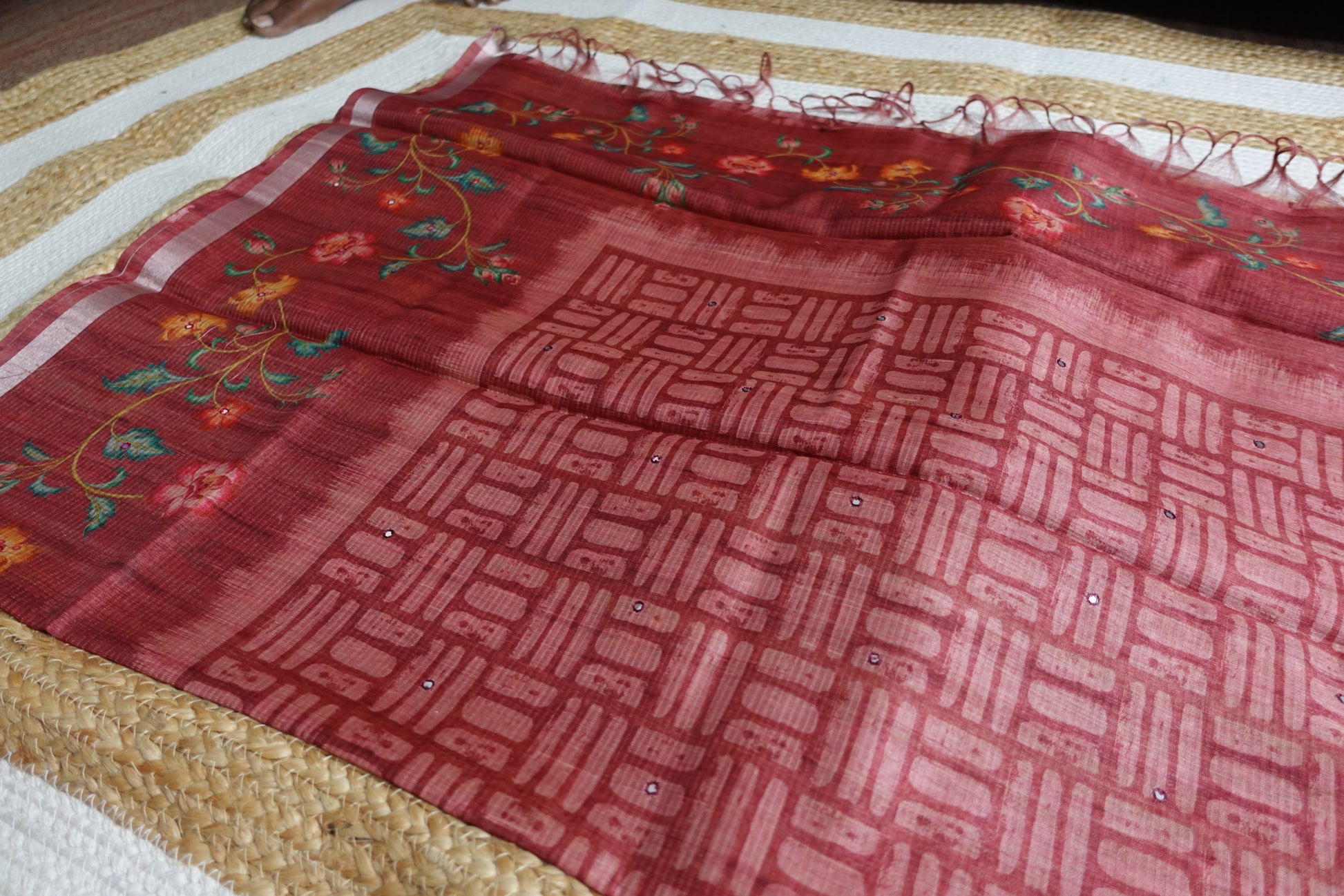 A red colored semi-Chanderi Saree with Floral Borders and Brick Pattern