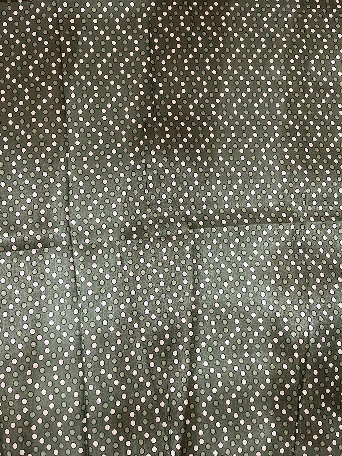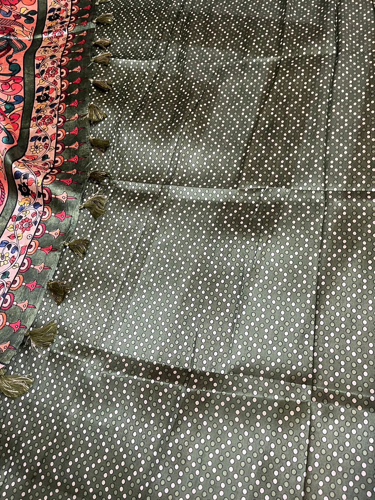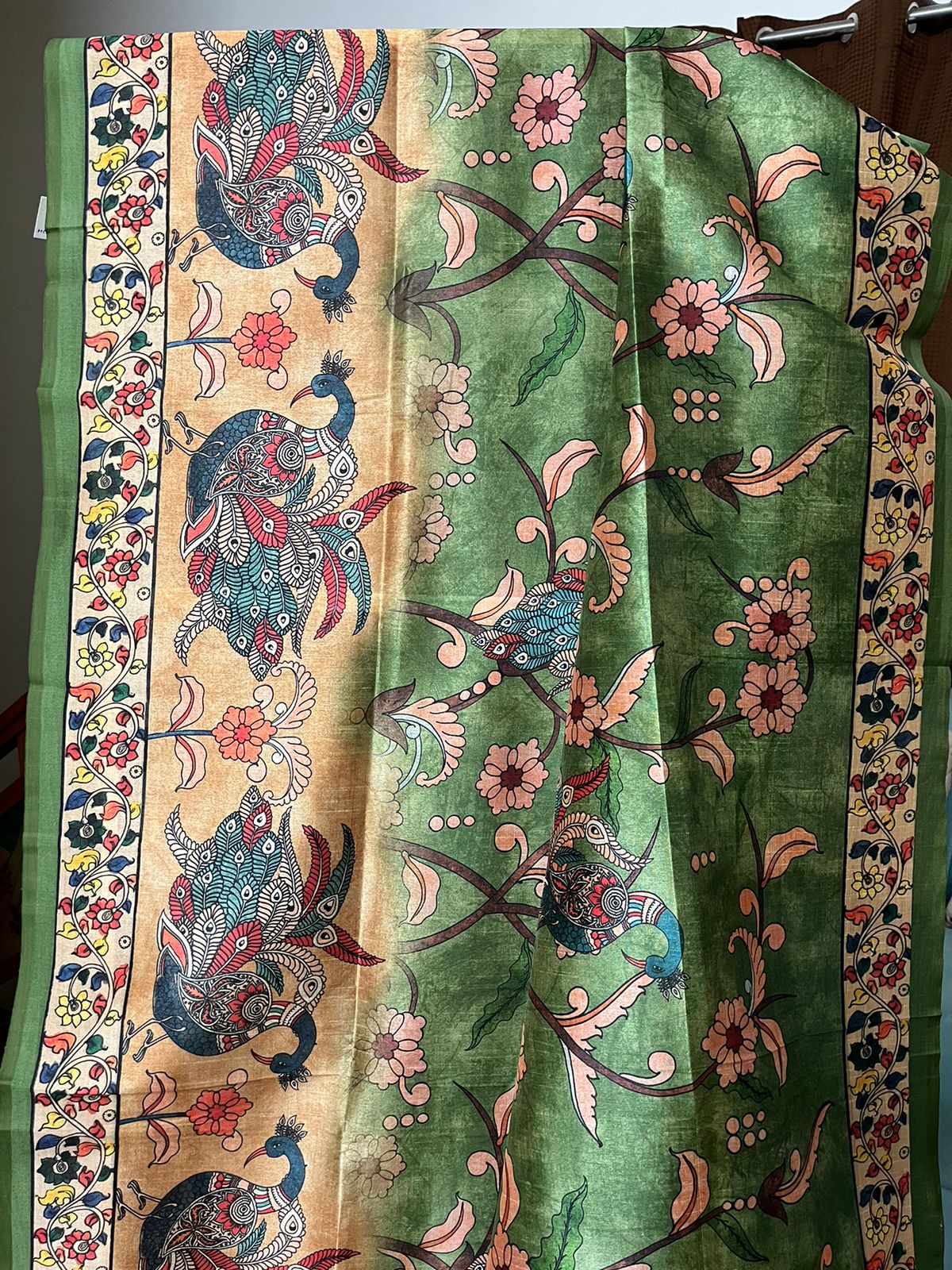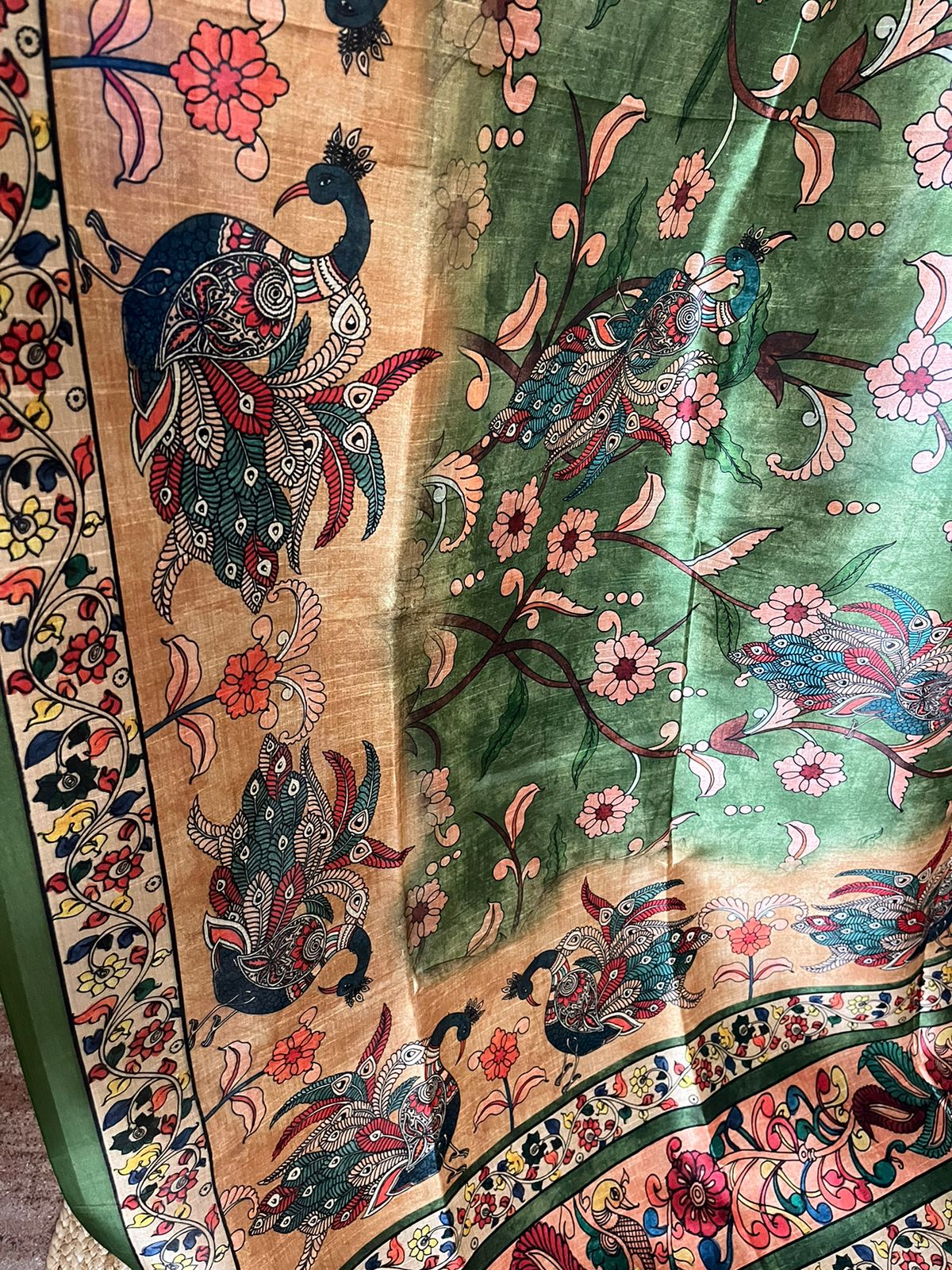 A green colored Semi Tussar Kalamkari print saree with pastel orange colored border.