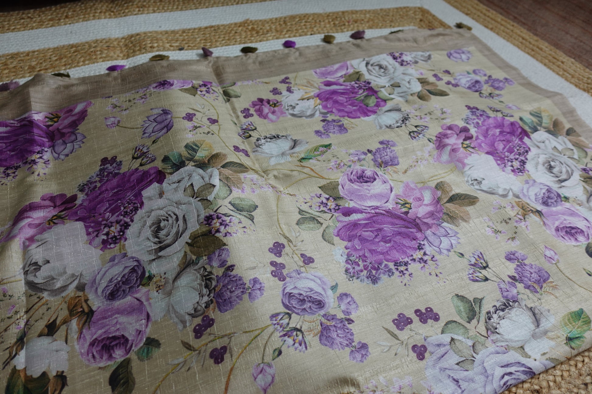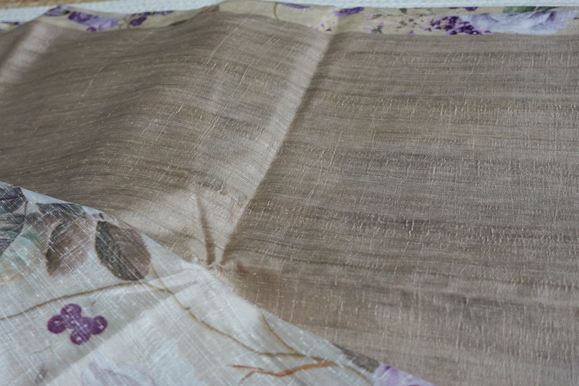 Elegant and enchanting, this beige green semi tussar saree is beautifully adorned with white and purple rose floral prints, blending soft sophistication with a touch of romantic charm. The muted green-beige base creates a serene canvas for the delicate blooms, making it a perfect choice for daytime celebrations, garden parties, or graceful festive wear. The semi tussar fabric adds a gentle sheen and fluid drape, enhancing its timeless appeal.