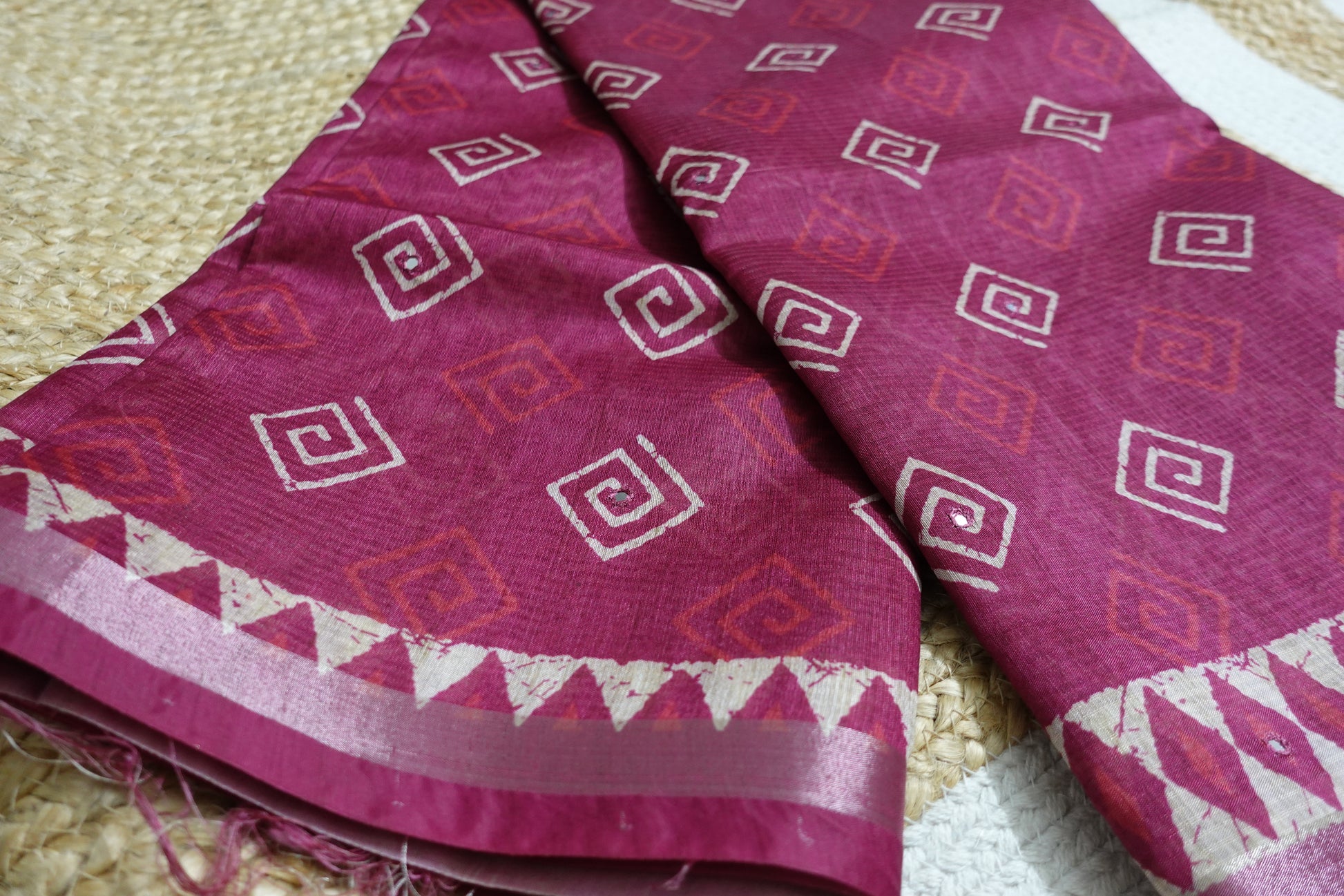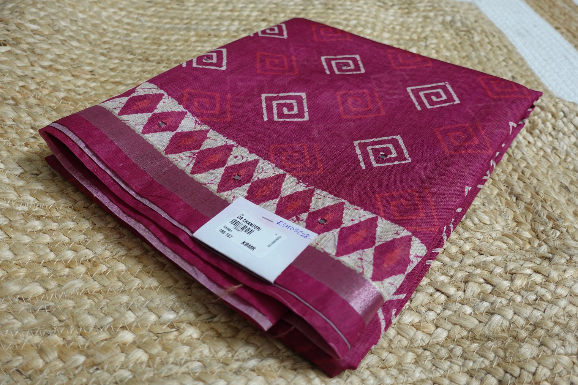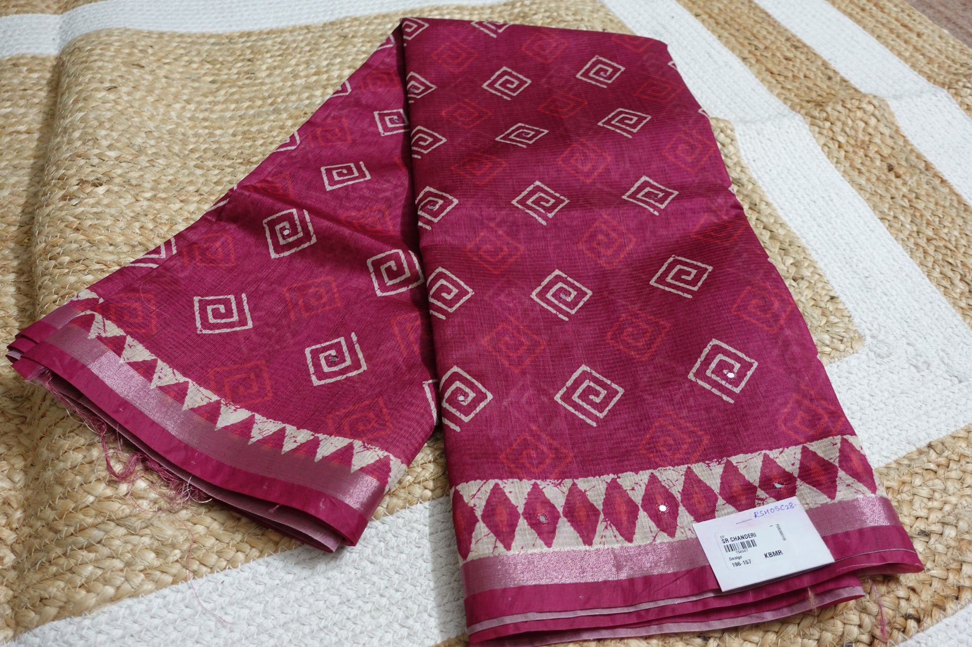 Make a bold yet graceful statement with this wine-colored semi-Chanderi saree, featuring elegant diamond pattern prints that add texture and charm to its rich hue. The saree is accentuated with a sleek 1-inch silver border, offering a subtle shimmer that enhances its festive appeal. Crafted from semi-Chanderi fabric, it combines the traditional elegance of Chanderi with a softer, breathable feel—perfect for both celebratory occasions and refined everyday wear. Its lightweight drape and timeless design make it a versatile addition to any ethnic wardrobe.