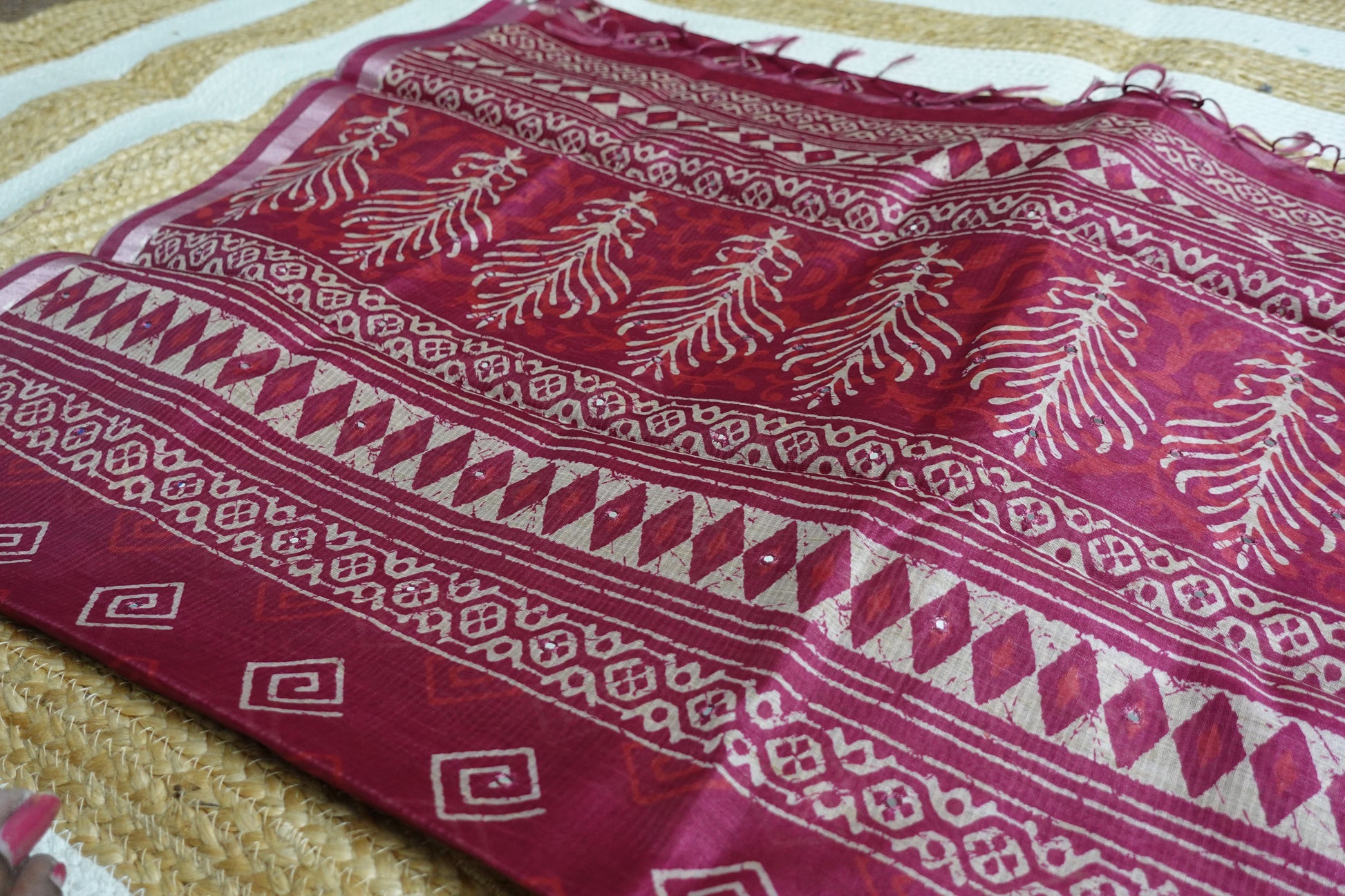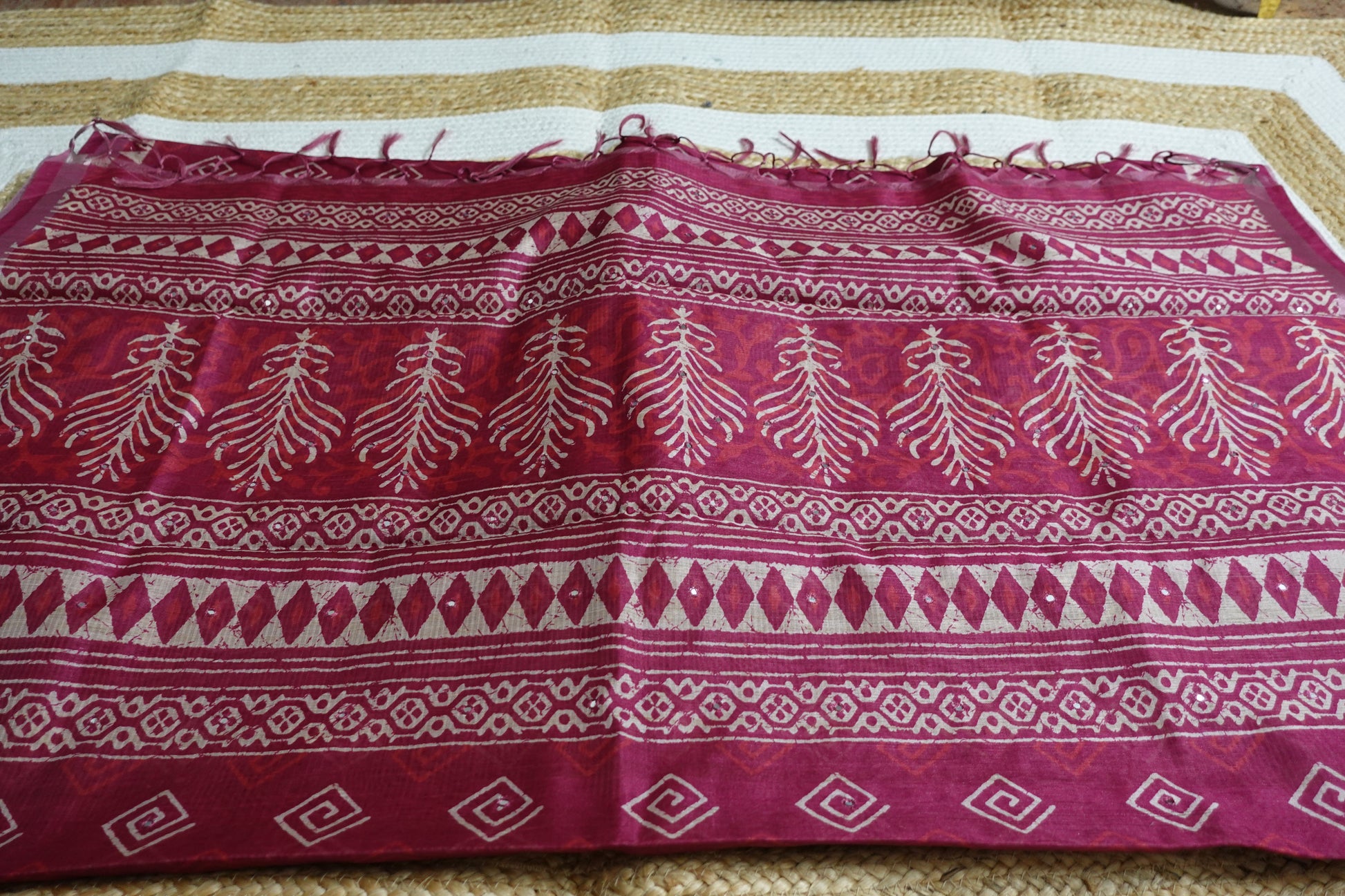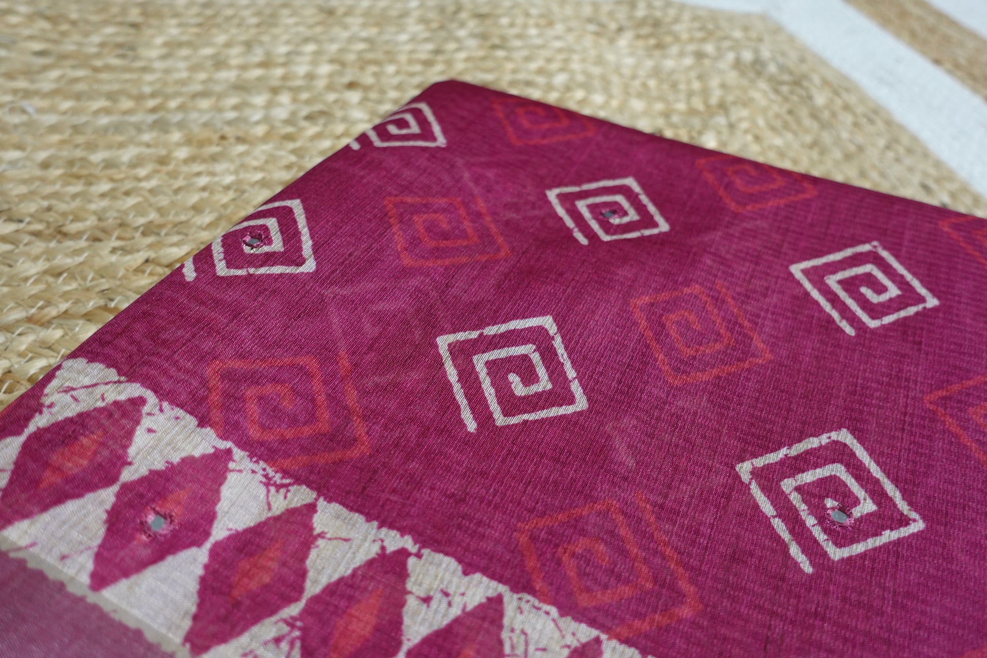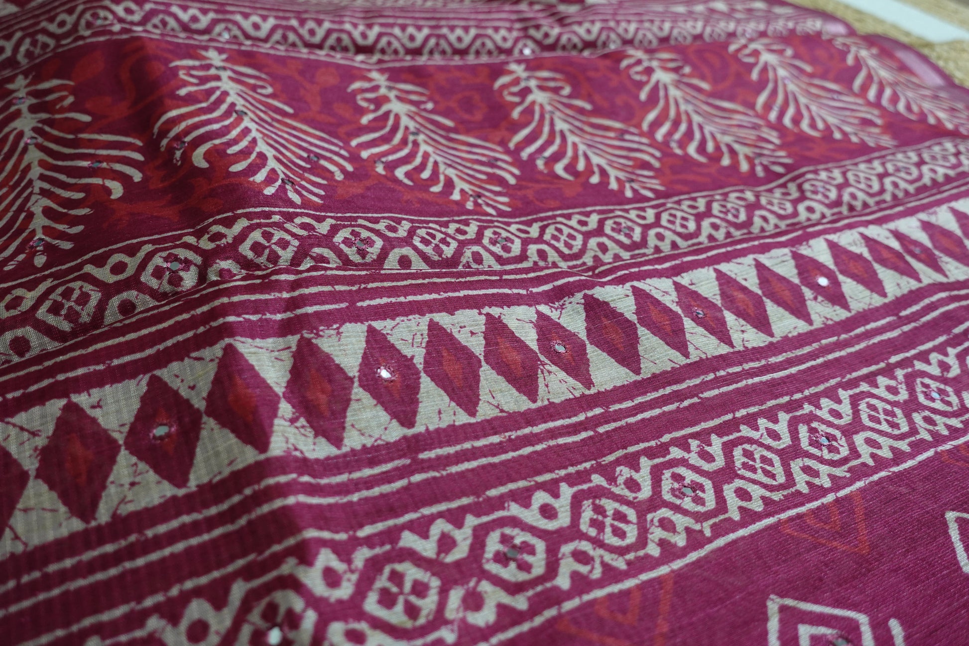 Make a bold yet graceful statement with this wine-colored semi-Chanderi saree, featuring elegant diamond pattern prints that add texture and charm to its rich hue. The saree is accentuated with a sleek 1-inch silver border, offering a subtle shimmer that enhances its festive appeal. Crafted from semi-Chanderi fabric, it combines the traditional elegance of Chanderi with a softer, breathable feel—perfect for both celebratory occasions and refined everyday wear. Its lightweight drape and timeless design make it a versatile addition to any ethnic wardrobe.